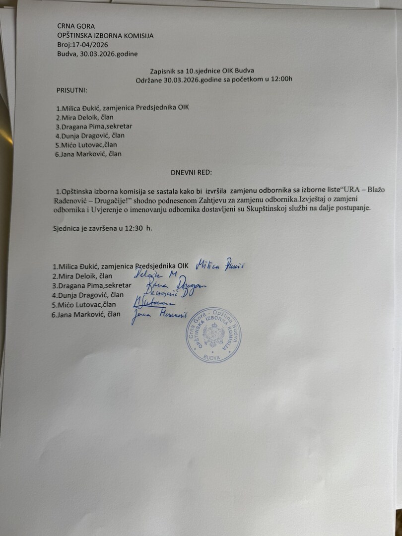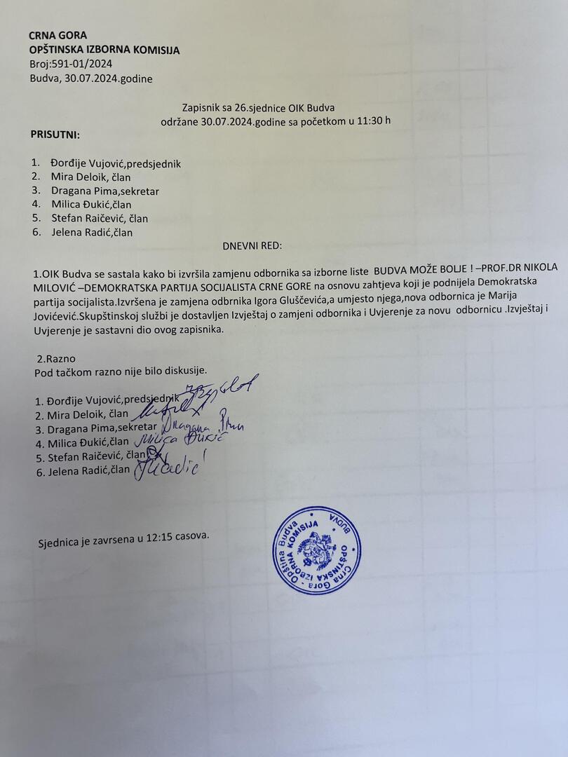 Zapisnik sa VI sjednice OIK Budva održane 09.05.2022. godine u 17:00 časova