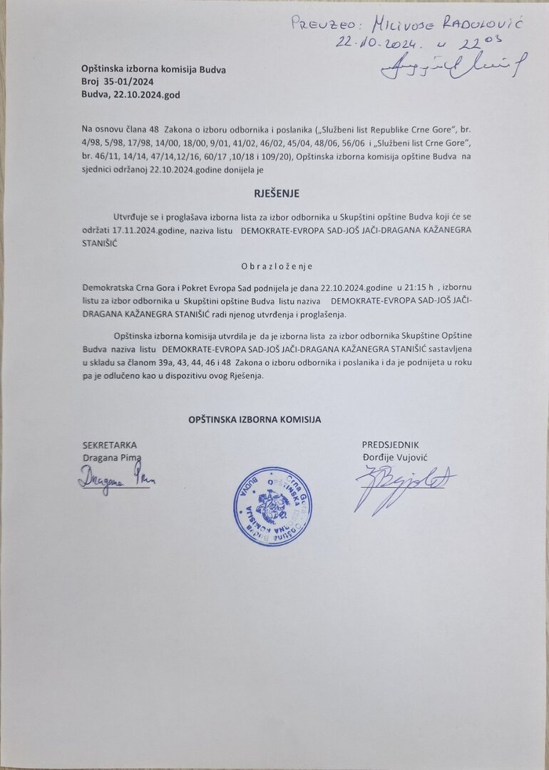 Izborna lista za izbor odbornika u Skupštini opštine Budva – MILO BOŽOVIC-BUDVA NA PRVOM MJESTU!