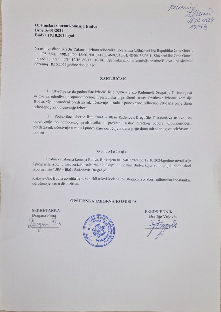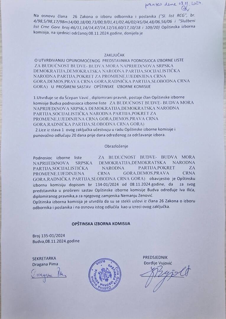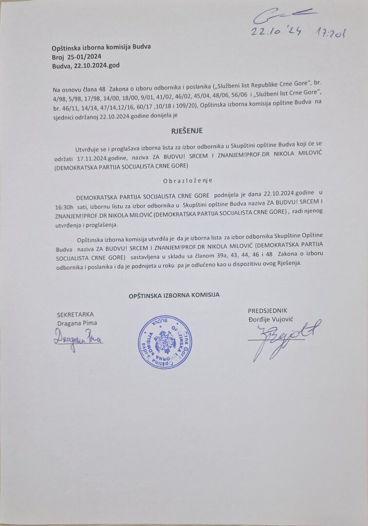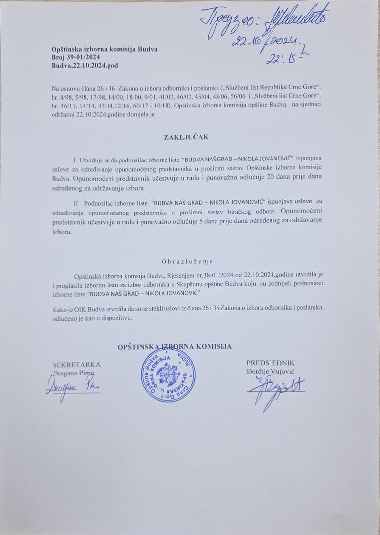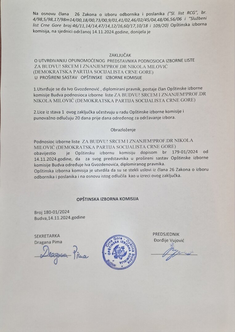 Na osnovu člana 48 Zakona o izboru odbornika i poslanika (,,Sluzbeni list Republike Crne Gore”, br. 4/98, 5/98,17/98, 14/00,18/00, 9/01, 41/02, 46/02, 45/04, 48/06, 56/06 i „Sluzbeni list Crne Gore”, br. 46/11,14/14, 47/14,12/16, 60/17 ,10/18 i 109/20), Opštinska izborna komisija opštine Budva...