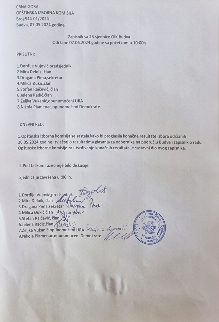 Zapsinik sa 9 sjednice OIK Budva održane 29.04.2024 u 16:00č
