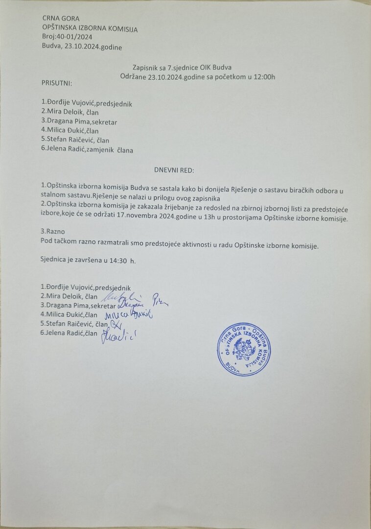 Zapsinik sa 7 sjednice OIK Budva održane 25.04.2024. sa početkom u 18:00 č