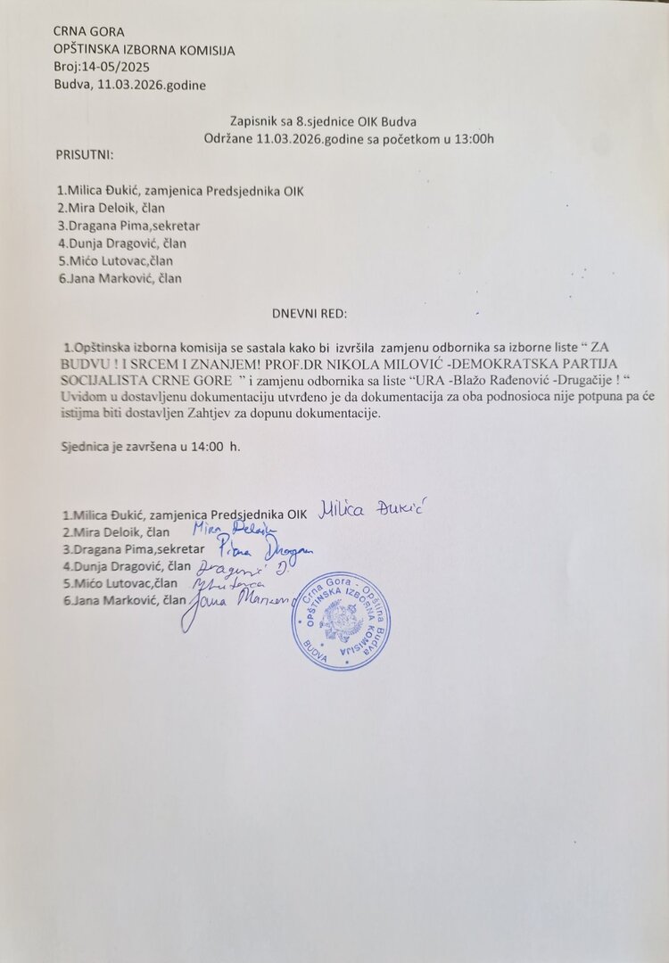 Zapisnik sa VIII sjednice OIK Budva održane 11.05.2022. godine u 11:30 časova